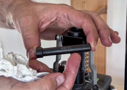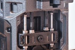 Auch hier ist ein bisschen Montage angesagt. Ich habe mit der Montage der sekundären Geschossführung begonnen und diese Baugruppe mit den vier mitgelieferten Schrauben und zwei Führungsstangen an der Unterseite des Werkzeugkopfes montiert. Ich habe auch die Rückholfeder zwischen der Zuführung und dem Werkzeugkopf installiert.