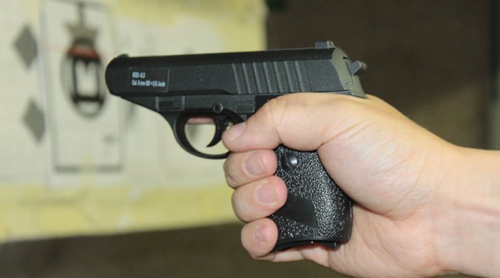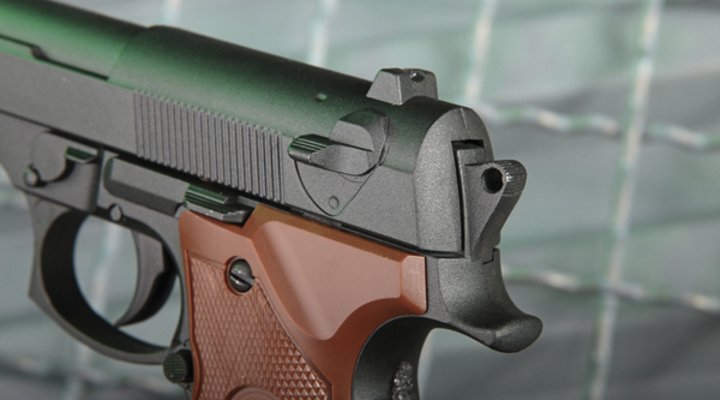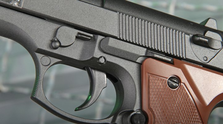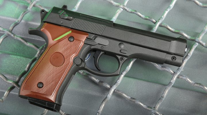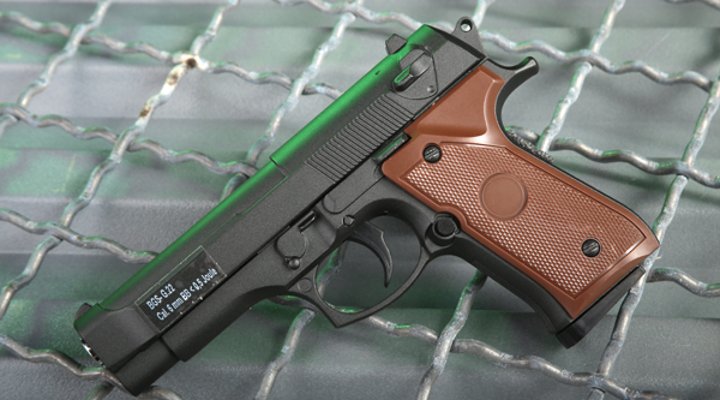 Auf den ersten Blick erkennt man, die BGS G.22 wurde inspiriert vom Design einer italienischen Pistole, die der US Army als Dienstpistole dient. Sie wurde aus Zinkdruckguss gefertigt und die braunen Kunststoffgriffschalen bilden dazu einen schönen Kontrast. Mit 270 g ist sie etwas leicher als die BGS G.3, übertrifft sie aber mit 15,5 cm in der Länge.