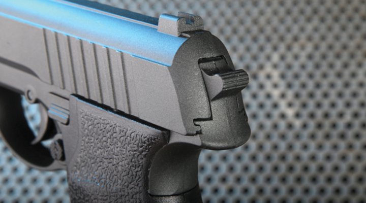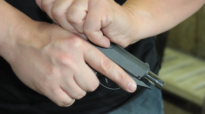 Mit einem Druck auf den Magazinhalteknopf das Magazin entnehmen, die Feder herunterziehen und das Magazin mit 6 mm BBs füllen. Dann einmal den Verschluss feste zurückziehen, um die Feder zu spannen und schon können Sie den ersten Schuss absetzten. So geht man auch bei jedem weiteren Schuss vor. Der Abzug steht dabei trocken und fällt nach Schussabgabe einige Millimeter durch.