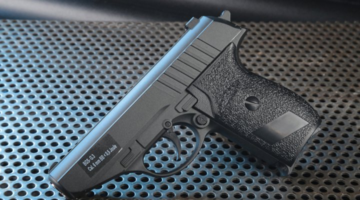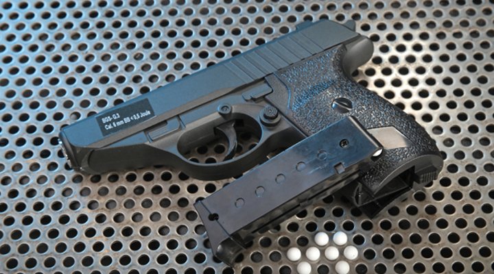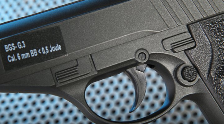 Die kompakte Airsoft-Pistole BGS G.3 besteht bis auf die Kunststoffgriffschalen komplett aus Metall. Griffstück und Verschluss sind aus Zinkdruckguss gefertigt und schwarz lackiert. Mit 282 g bringt sie für ihre kompakte Länge von 15 cm ein angenehmes Gewicht auf die Waage. Eine kleine Packung 6 mm BBs liegt bei, damit man das neun Schuss-Magazin schnell füllen und Spaß haben kann. Ihr Design ist inspiriert von mehreren Vorbildern deutscher Hersteller.