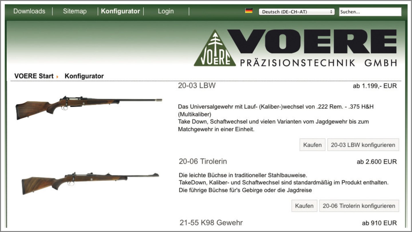 Der Kunde kann verschiedene Modellausführungen (Standard, Luxus, Take Down), das Kaliber, die Lauflänge, den Schaft, das Magazin, die Sicherung, Abzug, Schaft und Zubehör individuell wählen. Der Konfigurator zeigt Fotos sowie Preise der Komponenten und der individualisierten Waffe an.