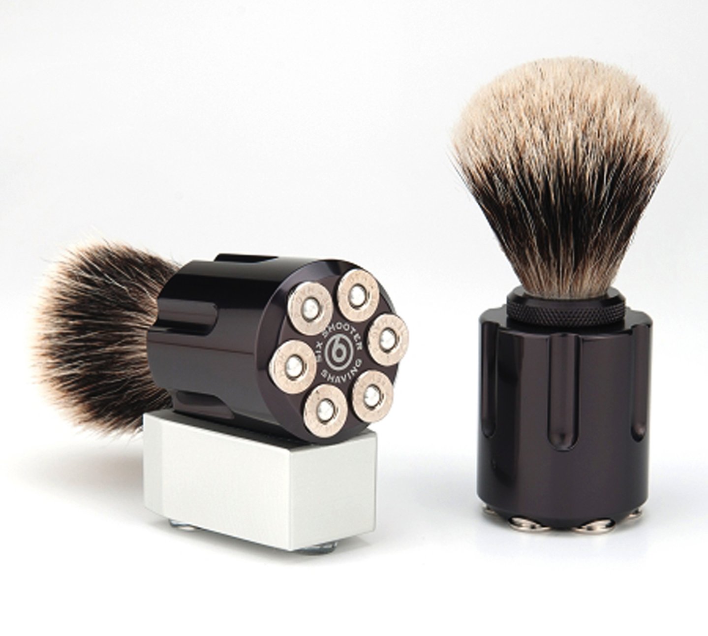 Der Haustürgriff ist haargenau dem eines Colt SAA nachempfunden? Rasiert wird sich auch nur mit frisch abgezogenem Messer? Dann könnte die Six Shooter Redemption Brush etwas für Sie sein: Ein Rasierpinsel im Design einer Revolvertrommel. Die besteht aus schwarz eloxiertem Aluminium, die Hülsenböden aus Nickel. Der Pinsel selbst ist aus Marderhaar, wie es sich für ein gutes Rasiergerät gehört. Das Ganze kommt in einer Holzbox als Geschenk verpackt. Wie so oft bei solchen Gimmicks muss man das Teil direkt in den USA bestellen - zum Preis von 149 Dollar.