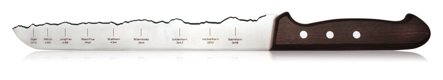 Die Schweiz. Da denkt so mancher zuerst an Berge und Messer. Andy Hostettler bei der Firma PanoramaKnife aus Ermatingen dachte daran wohl auch – und sponn den Gedanken ein Stück weiter. Heraus kam das PanoramaKnife. Dessen Klinge verfügt über einen ganz speziellen Wellenschliff, der die Formen von diversen Gebirgsketten nachzeichnet. Angefangen mit dem Berner Oberland (im Bild) über die Walliser Alpen bis zum Lac Léman haben es bis jetzt die Panoramen von sieben typisch schweizerischen Gebirgsformationen aufs Messer geschafft. Gefertigt werden die Messer von H. P. Klötzli. Damit auch Ortsunkundige aus dem „großen Kanton“ sich zurechtfinden, sind die Berggipfel einzeln auf der Klinge markiert. Kaufen können Sie das Messer direkt beim Hersteller zu Preisen zwischen 69 und 79 Franken.