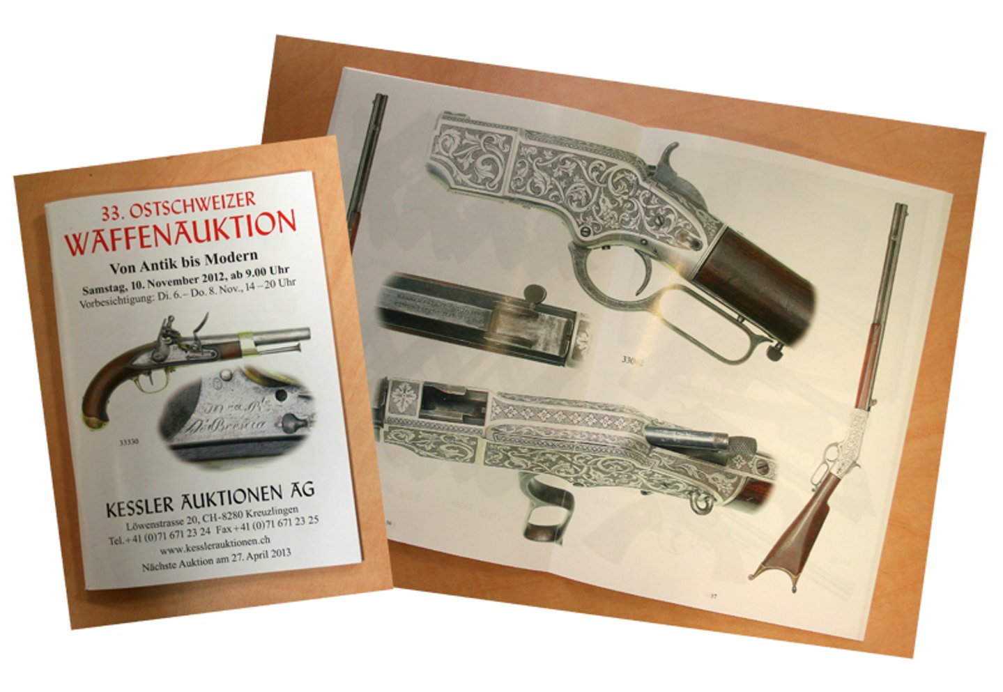 Und wer wie der Autor den Katalog gleich als Erstes in der Mitte aufschlägt, der stößt auch directamente auf eins der Highlights: Auf eine Winchester Rifle des Typs M 1866 - aber eine in ungewöhnlichem Äußeren. Das liegt nicht nur an dem versilberten und mit Rankenornamenten im Nimschke-Stil verzierten Systemkasten, sondern vor allem an den Details der Schäftung: Die Büchse hat einen angeschraubten Vorderschaft, dem der obligatorische Metallabschluss fehlt. Außerdem gibt es am Kolben keine der à la Pennsylvanian Long Rifle tief ausgekehlten Kappen des Typs "Crescent Butt Plate", sondern eine aus Messing, die beinahe so aussieht wie die eines Schweizer Feldstutzers. Und das führt denn auch auf die richtige Spur: In den 1860er Jahren bemühte sich Oliver Winchester bei den Eidgenossen um einen Regierungsauftrag. Doch votierten die Schweizer schließlich für das landeseigene Vetterli-System. Winchester hatte das Nachsehen - jedoch kamen einige seiner Repetierer ins Land von Rösti und dreieckiger Nuss-Schokolade. Vor allem die Züricher Firna Weber-Ruesch brachte dann einige nach Gusto ihrer Klienten überarbeitete Muster hervor - eins davon kommt hier zum Aufruf für Sfr. 12000/24000,-