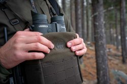 Our hunter carries binoculars in a practical adjustable modular harness. This practical solution allows 10x42 and 8x56 binoculars to be carried in the field with maximum comfort, thanks to the fully adjustable padded shoulder straps. The case has an easy opening system requiring only one hand. Thanks to the laser-cut MOLLE panels on the front, sides and bottom, it allows the attachment of additional carrying solutions and accessories. It offers the user adjustable shoulder straps, binocular retaining straps and EVA shock-absorbing inserts. It is equipped with an elasticated laser rangefinder pocket with MOLLE interface. Available colours are green moss and Realtree Edge camo. This accessory is part of the Neo Rifle line, designed specifically for hunting with a rifle.