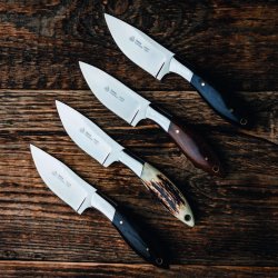 The Roka, on the other hand, is considerably narrower, but also comes with a blade length of 90 mm for an overall length of 198 mm. The blade is 3.5 millimeters thick. On the back of the knife is a ribbing, which gives the thumb more grip when applying pressure. This is safer and more comfortable, for example, when caring for hunted game. The Roka has no bolsters, while there are two different materials to choose from for the handle scales: Walnut or black G10. In keeping with its compact dimensions, Puma IP has designed the new Roka in particular as a "knife for all occasions". To match, the Roka also comes with a leather belt sheath. According to Puma, it will be available from the beginning of May 2022.