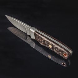 The Knife of the Year 2022 from Puma comes with a 9.5 cm blade made of Balbach SuperClean Damascus. The stainless steel is hardened to 60 HRC. The overall design of the knife is based on the well-known skinmaster model. In addition to the blade, the bolsters are also made of Damascus steel. The difference is that the blade is deep etched, which provides a more beautiful image of the characteristic patterns. The customer has a choice of two versions for the handle scales of the knife, which is 209 millimeters long overall: the Knife of the Year 2022 comes with bog oak scales, but for those who like even more extravagant options, Puma also offers a variant with handles made of carbon with embedded copper filings.
