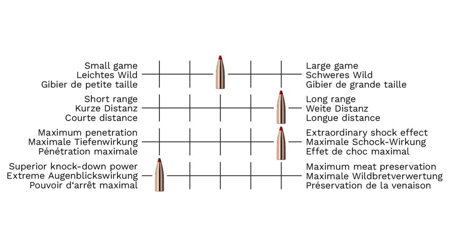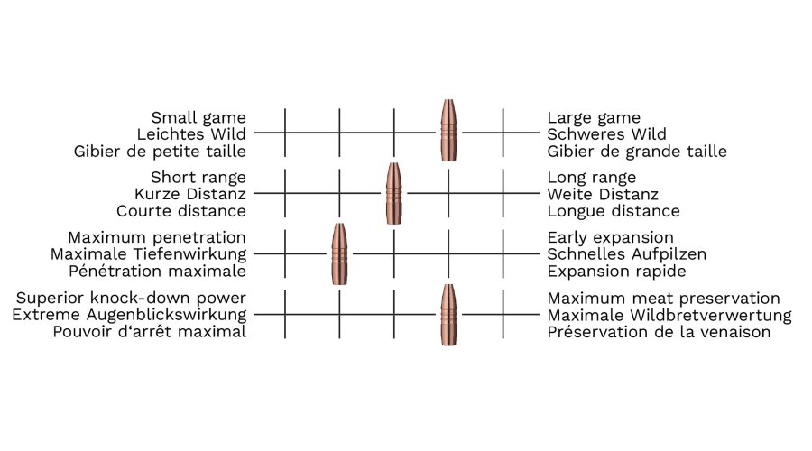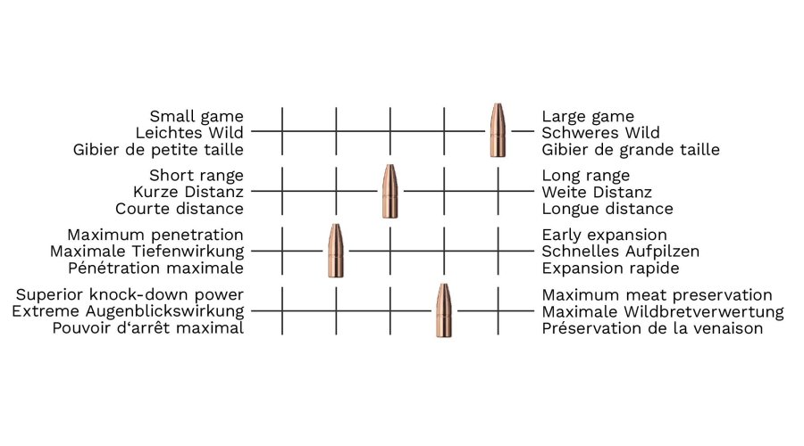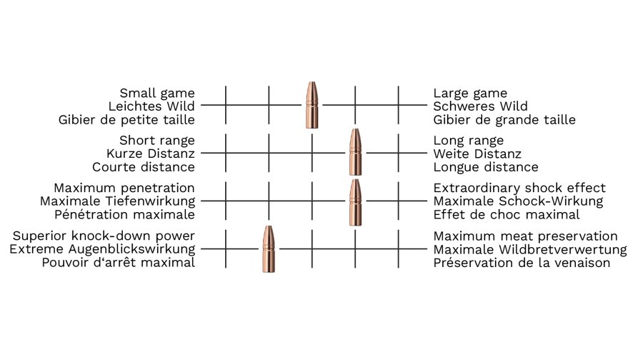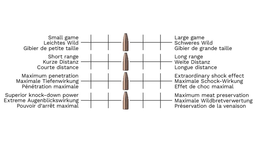The GECO Softpoint ("The classic bullet") is completely different: the bullet is a classic semi-jacketed type that has proven itself in hunting for decades. It impresses with its reliable energy release, good penetration and controlled deformation in the body of the game. The soft lead tip ensures rapid mushrooming and thus a high stopping effect. This makes this cartridge almost universally applicable, as the performance diagram in the picture gallery below shows: the Softpoint lies everywhere between the extremes, so it can do everything without being a specialist.