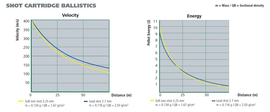 Based on international sales figures, only steel shot has established itself for waterfowl hunting by a wide margin. To achieve a sufficient effect with steel shot, it is often generally recommended to choose the shot pellets 0.5 mm larger. The fundamental problem is the considerably worse shot pattern as a result. Although the larger steel pellets are slightly heavier than lead pellets, the larger surface area means that the pellet is slowed down more rapid in the air. This physical disadvantage (lower sectional density) also means that it penetrates significantly less even with the same impact energy. With both disadvantages, fewer hits remain, which kill less effectively. Nevertheless, steel shot is successfully used to hunt waterfowl in North America. However, their many years of usage show that 0.75 - 1 mm larger shot is required for a comparable range and effect (similar sectional density). In contrast to rifle calibers, new shot gauges are required for a proper use of steel shot, which are only available in newer and more powerful proofed shotguns (CIP).
