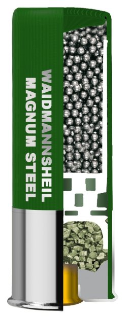 The corresponding variant in 12/70 and 20/70 is called ROTTWEIL WAIDMANNSHEIL STEEL HV (HV for High Velocity) and is categorised as a "rapid soft iron cartridge". It is available in 12/70 with a 32-g shot payoad between 2.70 and 3.75 mm in pellet diameter and with a 24-g steel shot payload in 20/70 (2.50 to 3.75 mm shot pellets diameter). Here, too, the shotgun must be proofed for use with steel shot.
