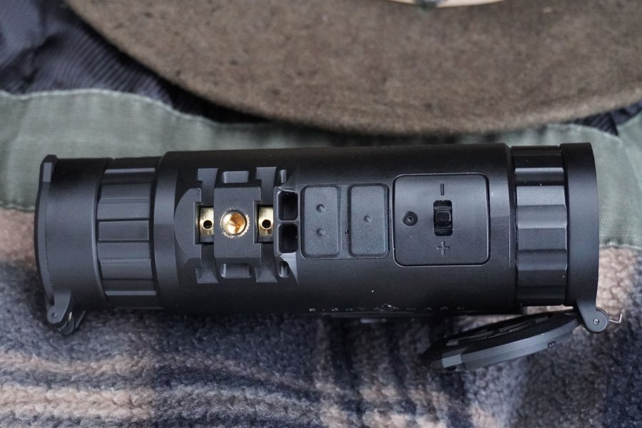 The original power supply for the Wraith 4K monocular is provided by two standard CR123A 3V batteries, which are located under a flap on the left-hand side of the battery compartment attached to the bottom of the tube together with the IR module. Alternatively, power can also be supplied via the aforementioned USB-C socket, which is also used for data transfer. The socket is protected from dust and water under a rubber flap on the right-hand side, i.e. on the back of the battery compartment. If you don't want to buy batteries all the time, you can also use CR123A rechargeable batteries or an external power bank. The latter even works without batteries or rechargeable batteries in the device. Depending on the ambient temperature, the batteries last for up to 2 hours with the IR illuminator switched on or up to 4 hours in daylight. Sightmark also has its own power bank customised for its devices. But more on that later.