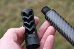 The barrel shows a capped thread and is supplied with a multi-port muzzle brake, the crown is neat with an 11-degree taper, spanner flats and locknut ensure the brake won’t come loose accidentally affecting zero.