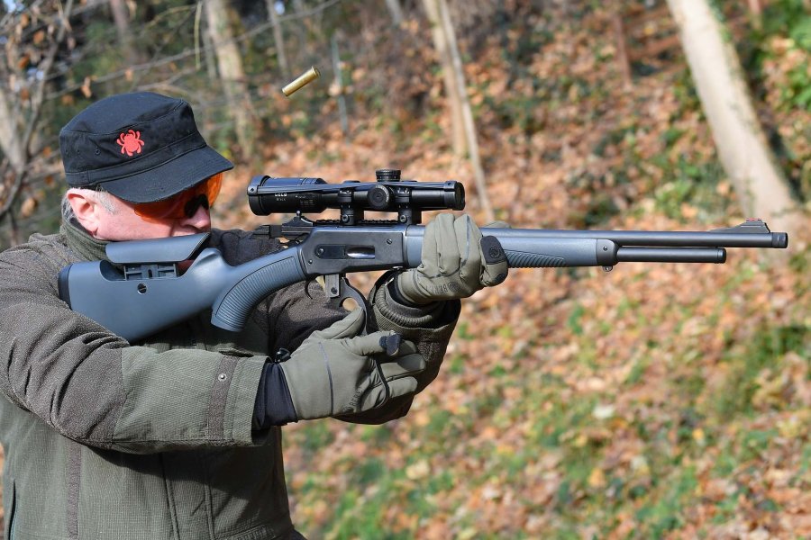 The first impact with the Pedersoli Boarbuster Shadow lever action rifle is really positive. Balance and handling feedback surprised me, maybe I am not so used to lever action rifles, but I must say that the front heavy muzzle – compared to a bolt action rifle of the same barrel length (19"/483 mm) – due to the use of a Bull Barrel and a lighter polymer stock in the back, as well as the tubular under-barrel five-cartridge magazine, helps with handling and fast sweep speed but at the same time is not so much that it increases inertia and tends to overrun my aimed point.