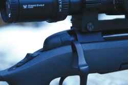 The test rifle was fitted with a Vortex Strike Eagle 5-25x56 riflescope using an Eratac block mount. The Eraloc quick release and the Erasilencer SOB 2S silencer came from the same manufacturer. The silencer is described as a hybrid, with a core and aperture part made of highly tempered stainless steel and an outer shell made of high-strength aluminum with reinforced walls. According to the manufacturer, this silencer is also suitable for use in shooting cinemas. There were compromises with the trigger. This is described by Steyr as a double stage type with set trigger. Unfortunately, there was no trigger wall to be found on the gun tested. After some pre-travel, the trigger broke quite sluggishly and slipped. Even with the set trigger option, the characteristics were not more satisfactory. The measured pull weights of the trigger (approx. 830 g and 170 grams whit set trigger) would basically be a very good match for the rifle. Feeding of the bolt-action rifle did not cause any problems: the detachable double-stack polymer magazine can also be easily loaded with cartridges from above when inserted into the rifle. The two buttons on the right and left of the magazine must be pressed simultaneously to remove the cartridges. Four 6.5 rounds fit into the magazine, another one into the chamber.