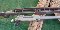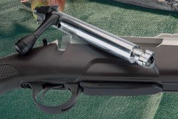 The barrel surface is protected by a matte silver Cerakote finish that matches the color of the receiver. The three-lug bolt has a 60° throw and houses a solid extractor claw and opposite to it, in the recessed bolt face, the spring-loaded ejector. On the Rover G2 Pathfinder models, Sabatti provides the bolt cylinder, which is turned and milled from a solid round steel billet, with a high-gloss hard chrome finish. The bolt shroud and bolt handle, on the other hand, have a matte black finish. The barrel features a 5/8 "x24 UNEF muzzle thread on the front end and a barrel extension on the other end, which is screwed into the action.