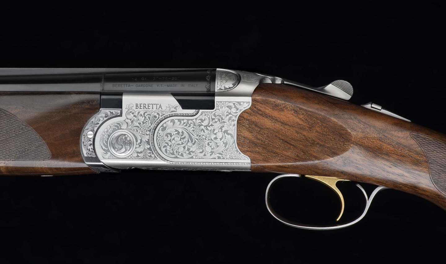 For this shotgun the most modern Beretta five-axis laser technology was used, capable of engraving even rounded surfaces with great harmony and reproducing, even in the bas-relief areas, a precious contrast effect that tipically characterizes premium shotguns. The top view of the gun shows a special finish that highlights the new engraving of the opening lever, the elegant design of the receiver, and the pattern on the locking shoulders. The single selective trigger is gold-plated. The selector is located inside the safety tang which, with a quick and easy sideways movement, allows the user to select the barrel for the first shot.