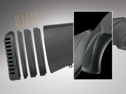 Synthetic furniture includes a slim-profile forend coupled to a user-configurable stock for length-of-pull (13-14.25 inches), drop, and cast using incremental stock shims – all with Mossberg's signature texturing for a secure grip. Stock is self-draining too.
