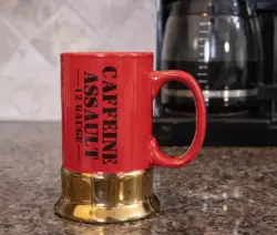 Caliber Gourmet Caffeine Assault coffee mug in shotgun shell design