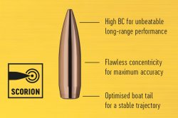 If you want to be at the forefront of centerfire long-range shooting at distances of up to 1,200 meters, you should take a closer look at the RWS Target Elite Plus. The fact that RWS has a suitable and precise solution for this purpose with the Target Elite Plus Target Elite Plus is not least due to the in-house bullet with which the manufacturer manufactures this cartridge. The handloader quality match cartridge is fitted with the Scorion bullet, a streamlined hollow-point bullet with a boat tail that has excellent aerodynamic properties.