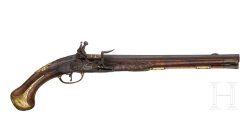 Let's go back more than a century and move to the Old Continent for lot 11077, a German flintlock pistol built around 1730 by the Munich gunsmith Christoph Joseph Frey. This German craftsman built pistols and rifles of excellent quality and was declared court gunsmith by the Electoral Prince of Bavaria in 1746. Frey's pistol has a smoothbore Damascus barrel in 14-mm caliber with a silver mask sight, a finely engraved lock, and a gilt brass counter lock with a depiction of an equestrian battle. The stock is made of walnut wood with a horn tip. At the base of the barrel is the gold inlaid signature "C. Ios: Frey In Mynchen". This fine 18th century piece was also sold for 2.100 euros.