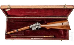 Lot 2298 is the great-grandmother of the PCC, or pistol caliber carbines. It is in fact a rare semi-automatic Mannlicher system carbine model 1897/01 chambered in 7.65mm Mannlicher made by SIG of Neuhausen and with serial number 712. The gun comes in a maple wood case lined with red velvet, with an original ramrod and a bearing the name “Carlos Rasetti, Buenos Aires” on the lid. Founded in 1857 in Buenos Aires, Carlos Rasetti's was one of the most famous gun importers in Argentina, publishing lavishly illustrated catalogs, as well as importing many European brands to South America starting with DWM. We did some research and discovered that the Carlos Rasetti ceased operations in 1967. In all likelihood, this carbine was a presentation model. Doubly interesting because of both the model and its particular case, this gun of yesteryear will be auctioned off starting at 6100 euros.