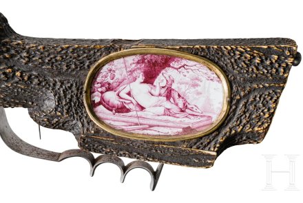 Lot 2039 is an extraordinary German wheellock rifle, manufactured in Augsburg around 1660 featuring an octagonal barrel in 12.5 mm caliber. The wheellock with internal wheel features a wild boar hunting scene, the cock engraved with sea monsters. The wooden full stock, is veneered with staghorn plates, stamped “EB” on the inside. On the left side of the butt is an enameled copper plaque with a depiction of Diana resting with her hunting dogs in a gilt brass frame. The stock has a smooth iron trigger guard. The ramrod thimbles and buttplate are also staghorn. It is very likely that this weapon came from the armory of the Grand Dukes of Saxe-Weimar in the Ettersburg Castle, as suggested by the presence of the initials "EB" on the patch box. Weapons from the Ettersburg Castle armory were offered for purchase on several occasions in the late 19th century, with sales continuing until after World War I. The 1927 auction held by Fischer/Kahlert included among the lots for sale a wheellock rifle that was entirely veneered in staghorn, like the one presented here, and featured an enamel medallion on the butt. This gun is nearly identical to the one today in the collection of the Metropolitan Museum of Art in New York (Accession Number: 2015.446a-d), signed by Martin Kammerer, active in Augsburg. Wheellock firearms completely covered in rough staghorn with a largely natural finish were very much in vogue in Germany in the decades between the mid-17th and early 18th centuries. The few examples still surviving to this day suggest that Augsburg was the production center for these guns. A similar rifle is currently part of the collection of the Bayerisches Nationalmuseum in Munich (inventory number: W994). The starting price is €45,000.
