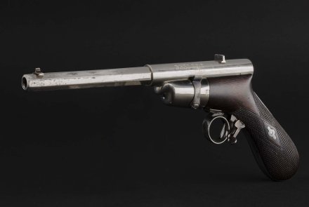 Lot 2605 is an example of how up to the 1960s attempts were made to improve the working principle of revolvers, in this case by introducing some complications. The Dardick revolver was produced in the USA from 1954 to 1962 and is named after its designer David Dardick. The main characteristic of this hybrid between a pistol and a revolver is the feeding that was done with special cartridges, called "Tround", that were in fact normal .38 Special or .22 Long Rifle caliber ammo wrapped in a triangular plastic profile. The cartridges were contained in the grip and thanks to a rotating feeding system they were presented to the breech; after firing the spent cartridge case was ejected from the side window. Conceived as a survival weapon (the "Tround" cartridges floated even when loaded) and for law enforcement, the Dardick pistol could be equipped with a conversion that transformed it into a carbine with a 20 inch long barrel. It was a flop precisely because it used proprietary ammunition, incompatible with any other gun. This oddity is in good condition and is sold in its original box complete with conversion to carbine and instruction booklet at a starting price of €1,500.