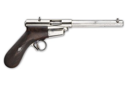 Lot 2291 is a firearm typical of the relatively short, but very rich for collectors transitional period, which saw the transition from the wheel gun to the semi-automatic through the manual repeating models. It is in fact the prototype of a Schulhof mod. 1887 repeating pistol. It is one of the many projects of Austrian gunsmith Josef Shchulof, born in 1824 and owner of several pistol and carbine projects. There are a handful of prototypes and models intended for sale of his repeating pistols, some with a rotary magazine (as in this case), others with a tubular magazine inside the grip. This particular example is in 8mm Schulhof caliber, with no serial number. The prototype Schulhof pistol features an octagonal barrel with six rifling grooves, 155 mm long on which is mounted a dovetailed blade sight. The rear sight is also dovetailed on the receiver. The pistol, which is a repeating (not semi-automatic) gun employs a rotary magazine with a capacity of six rounds. To repeat the shot the cocking lever with the ring must be moved forward and then backward. The left side of the receiver is marked "Bréveté". The safety lever and action ring are checkered and all metal parts are nickel-plated. On this example there is some spotting on the barrel, minor handling marks on the receiver and grip. The sights, action ring and trigger show traces of bluing. The checkered grip is made of walnut wood. This pistol is illustrated and described in the Mötz/Schuy volume, "Vom Ursprung der Selbstladepistole" (The Origin of Semi-Automatic Pistols), pages 66-68. The starting price of this very interesting piece is €13,000.