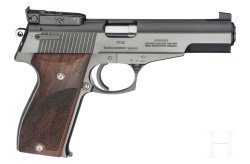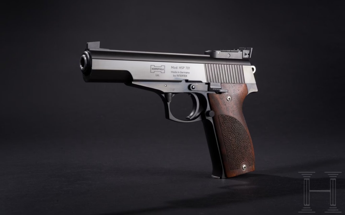 Lot 2289 is a Korriphila HSP 701 pistol, known as the "Weltmeisterpistole" (World Champion Pistol) is one of the pinnacles of modern German firearms manufacturing, linked to Edgar Budischowsky and the Intertex brand. Dieter Krause won two world titles with this pistol: in 1997 (Auto Match, Unclassified), and in 1998 (BDMP 1500). A unique piece of great technical, historical and sporting value. Designed for top-level sport shooting, this pistol is chambered in 9mm Luger, and has a 5-inch barrel with a mirror-like bore and German proof marks from 1997. The serial number, consistent on all parts, is 0702. The trigger is single-action and the single-stack magazine holds nine rounds. Of great interest is the Aristocrat Tri-Set adjustable rear sight, with three selectable settings to quickly adjust the point of impact.
