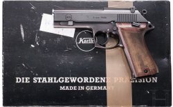 The original matte finish is >99%. Some minor defects caused by bad storage: the rear strap shows three specks with loss of finish, as does the floor plate. Otherwise, like new condition, with no signs of use. Impeccable walnut grips with fine checkering, a walnut insert as backstrap. Complete with original box with matching number, the insert a bit smelly from moisture in storage; lid with small tears at corners, brown wrapping tape all around. Korth patch present. Nearly as good as new, makes a great pair with the other Korth pistol with Serial number P090, showing the continuous development of Korth pistols. The starting price is € 5,200.