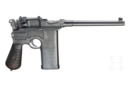 Lot 3046 is an interesting example of the Basque productions inspired by the Mauser C96, typical of the period between the two World Wars. The Beistegui Royal MM 31, second pattern, is a Spanish-made semi-automatic pistol chambered in 7.63mm Mauser, with serial number 30546 on all main parts, including the grips. It is the variant with a 20-round magazine. The 180-mm long barrel has a matte finish, while the front sight is paired to an adjustable slide rear sight, set from 50 up to 1000 meters, according to the typical Mauser C96-inspired pistol design. The proof marks bear the year 1931. As the only marking, on the left side of the barrel the words "MM 31" enclosed in an oval, indicative of the 1931 military model; production is attributed to Beistegui Hermanos of Eibar. The gun is probably re-blued, with light and diffuse surface spotting, while the hammer and receiver show a grey finish. The grips are made of dark walnut with horizontal grooves. The lanyard ring is missing and the full-auto mechanism has been deactivated. The starting price is 1,900 euro.