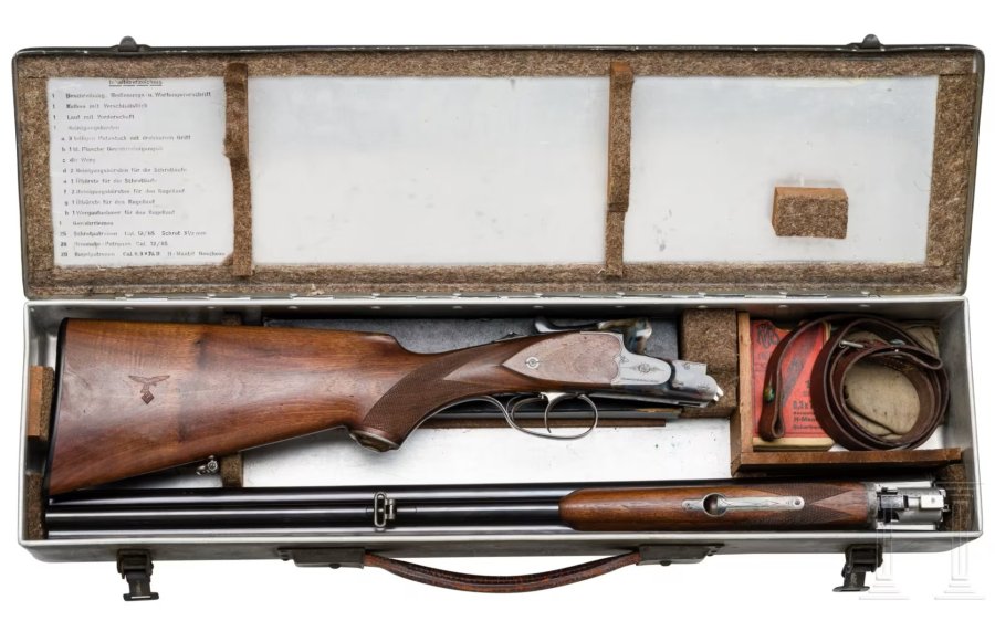 Lot 3355 is a real "Holy Grail" for military weapons collectors, even if at first glance one might think otherwise. This is a rare and fascinating example of the Sauer & Sohn M30 "Luftwaffendrilling", offered complete with its original case and in truly exceptional condition. It was a special version of the M30 Drilling combination gun produced by J.P. Sauer & Sohn for the Luftwaffe during the Second World War. In essence, it was not a "combat" weapon in the classical sense, but a survival gun intended for German aircraft crews, especially those operating on remote fronts such as North Africa. The idea was simple but very clever: to provide downed pilots with a versatile firearm that would allow them to obtain food and defend themselves while waiting for rescue. For this the Drilling system (three barrels) was chosen, which combined two smoothbore 12-gauge barrels for hunting small animals and birds and a rifled barrel in 9.3x74R for larger game or self-defense.