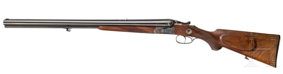 Original, color case hardened action with hammer-fired action and back-action spring on the right The hammer have a minor hairline-crack. Lock plate is marked "J.C. Fischer Schaffhausen". Richly grained stock with finely chiselled checkering and German cheek piece and iron butt cap. The ramrod is not original. A sling swivel is present. To operate the gun, after cocking the hammer, the cylinder must be pulled back firmly to the breech section to be moved further into the safety position. Then it can be rotated around a chamber before it snaps forward into its final position by means of spring tension. This rare combination of revolver and shotgun appears to be slightly reworked. Johann Conrad Fischer was an important European gunsmith: according to Der Neue Stöckel he visited Pauly and LePage in Paris and Joseph Egg in London. This is a piece of absolute rarity, in excellent condition. According to research, no other similar specimens are known. The starting price is 6,800 euros.