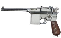 Lot 3402 is a 7.63mm 1932 ("Mod. 712") Mauser C96 pistol, here offered with shoulder stock/holster complete with rare leather harness. The consistent serial number for the entire gun is 92118. The barrel, 140 mm long, has the bore in excellent condition, the rear sight is adjustable from 50 to 1,000 metres. Crown/U proof marks and standard model markings are present. The hammer and trigger show the typical finish, while the original bluing is still present, albeit with normal signs of use.