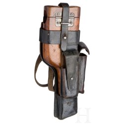 The lacquered walnut grips are well preserved and the pistol is equipped with a removable 20-round magazine. The lanyard ring is missing and the full-auto has been deactivated. Of particular interest is the matching wooden stock, with Mauser branding on the left side, which has a crack on the underside later repaired with reinforcing strips.