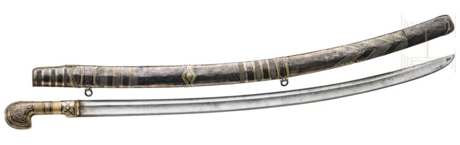 The Ottoman shashka is a sabre originating from the Caucasian regions characterized by a slightly curved blade and the lack of a pronounced guard, making it extremely maneuverable and fast in combat. It was mainly used by cavalry to deliver quick and effective blows from the top of the horse downwards. The specimen on offer from Hermann Historica is decorated with the niello technique. At the base of the blade, faint traces of an etching now difficult to read are still visible on both sides. The silver-mounted grip in the Circassian tradition with characteristic curved pommel, is slightly loose. The scabbard, made of silver sheet, is richly and uniformly decorated with engravings, nielloed and partial gilt: it has geometric fields, lozenges, latticework and intricate vegetable ornaments. The locket is slightly loose. On the back is a cartouche with an inscription in Arabic. Overall length is 93 cm. The starting price for this exotic sabre is 6,000 euros.