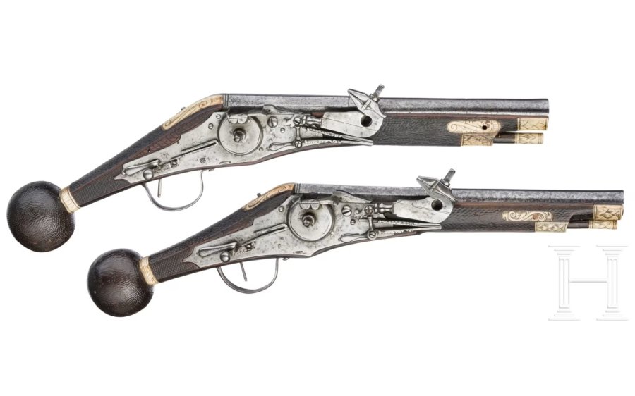 Lot 4856 consists of a pair of wheellock pistols for enlisted men of the Saxon Electorate Palace Life Guard (second model), circa 1580-1590. These are a pair of puffers, or Saxon wheel-guns, of very similar design, with smoothbore barrels in 16 mm caliber: one with octagonal cross-section and the other with round cross-section. One of the barrels bears the date 1588 on the breech together with a hunting horn mark; the second is marked with the monogram "NH". The metal surfaces show slight oxidation, staining and light pitting in places, consistent with the age of the guns. The locks have external encapsulated wheels and folding safety catches. The pan cover is spring-loaded, with a practical release button. One lock plate has a hunting horn mark, the other a mark in the shape of a hammer. The delicately burled, blackened walnut stocks feature inlays of engraved and blackened bone. On the spherical butt ends, Inlaid silver plaques with finely etched warrior's heads amidst leafy vines. Also original are the wooden ramrods, with engraved bone tips. The overall length is 56.5 cm each. From a historical point of view, this is a particularly interesting set: since a large number of these pistols were needed for the Saxon trabant guard (Sächsische Trabanten), different gunsmiths were commissioned to make the weapons according to a standard pattern. The markings on both pistols can in fact be traced back to two Saxon gunsmiths who were active at the time. The starting price for this lot is 18,000 euro.