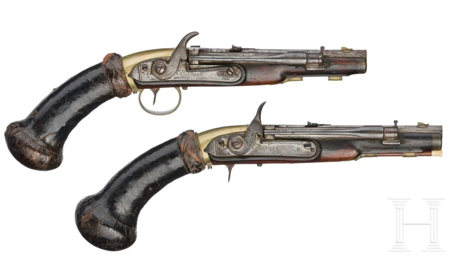 Lot 5048 is a rare pair of Girandoni system air pistols by Störmer of Herzberg, circa 1820. This pair of pistols has octagonal eight-groove rifled barrels in 9mm caliber. The brass front sights are dovetailed and the folding rear sights are iron. On the side is the tubular magazine for round bullets with spring-loaded slide. The lock plates, with external hammers, are signed "Störmer", while the counter plates with the safety levers bear the inscription "Herzberg" engraved. The frames are brass, with screw-mounted leather-covered air reservoirs; on one example the cover is incomplete. Brass mounts, one trigger guard is missing. Inset wooden cleaning rods with bone tips (one is missing). Length: 38 cm each. The pre-charged pneumatic system derived from the one developed in 1779 by Bartolomeo Girardoni, with a lateral breech-loading tubular magazine, allowed for very rapid firing. Ernst August Störmer (1776-1857) was appointed royal gunsmith at the Herzberg factory in 1802 and made numerous hand- and long guns based on Bartolomeo Girardoni's design. The starting price for this highly unusual pair is €7,500.
