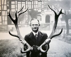 The antlers were shown at many exhibitions, were considered the strongest stag of 1935 and made even Reichsjägermeister Göring jealous when he saw them at the "Berlin Green Week". In the turmoil of war, the antlers remained in Suhl. In 1960, a gunsmith from West Germany found them again during a visit and on his next trip took a cheap pair of deer antlers in the trunk of his car, which he had entered in the border papers. He exchanged the two antlers, and the customs officers did not notice anything on the return trip. Today the antlers hang in the stairwell of the factory next to other magnificent trophies.