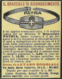 That's because the idea came to an engineer from Berlin who worked on logistics at the Prussian Ministry of War. While strolling through the capital and observing the dog tags that indicated the payment of the relative license fee, he got the idea for the much needed military identification tags. Over time, in international – but especially American – military terminology, the term “dog tags” spread. Some armies (the Italian and Austrian armies among them) during World War I adopted two-piece metal cases containing slips of paper with information about the soldier's identity. These had to be worn around the neck or – as in the case of officers, who could afford it – inside finer, specially made patented bracelets (see the Italian "Patria" bracelet, marketed by the Gaetano Boggiali company of Milan).