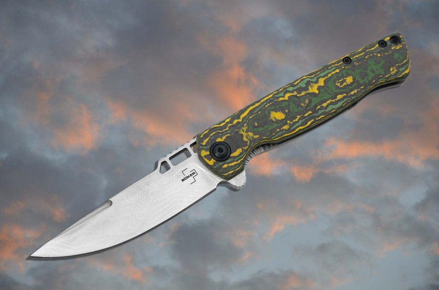 Parts from the cockpit armor plating, the crankshaft and its bearing cover were used to make the Damascus blade of the Böker ME 109 Damast, which measures 87 mm. The blade was forged by Chad Nichols, a famous U.S. forger, using a variant of the Wave-Pool pattern, which is not particularly contrasty but effective in suggesting a propeller's rotary motion. The opening at the back of the blade base has the unmistakable shape of a pilot's cockpit and is visible when the knife is closed and open. The false edge near the blade tip recalls the line of the recesses for the machine guns mounted on the engine cowling, also known as Motorkanone. The flipper for the blade opening takes up the outline of the Messerschmitt Bf 109E landing gear. The carbon fiber scales are made by the Lithuanian company Fat Carbon, which employed a multi-layer "Toxic Storm" coloring with a green base and yellow highlights, typical of Luftwaffe fighters of this era. The knife's frame is made of titanium, and the blade is locked open using a proven frame lock system. A titanium clip allows the knife to be carried in the "tip up" position. The Damast is forged in the USA while the knife is assembled in Taiwan. The Böker ME 109 Damast will be sold from January 2023 at a price of 399 euros complete with a case and certificate of authenticity. For now, the exact number of pieces that will be made has not yet been determined, but they will certainly not be many. Therefore, enthusiasts had better get moving well in advance.