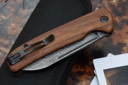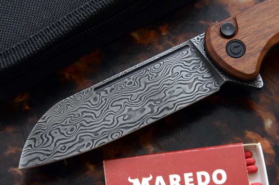 Aesthetics is always subjective, but there is no denying that the pairing of the blued tones of the Damascus steel and the warmth of the Bubinga wood handle is striking. It is not just a matter of color combinations: compared to the Micarta and G10 of the other versions, the tropical wood has a unique grain on each of the grips, almost a fingerprint that makes each knife unique and different from the others. The same can be said for the stainless Damascus of the blade, which, although industrially produced, benefits from a hand-finishing treatment that enhances its intricate texture. The whole is made homogeneous by the bluing of the small parts, the internal bolsters and the steel clip, which give the Chevalier a dark hue that conveys the impression of solidity on an aesthetic level as well.