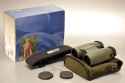The packaging includes a very traditional, nice and classically designed padded wool carry case, the manual, one of the most attractive and comfortable Neoprene padded straps we’ve ever come across, a rather brittle Bikini eyepiece rainguard (it broke in half during the tests) and a pair of removable, tethered objective covers.