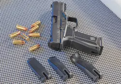 In a nutshell: like the X, but with a significantly shorter grip. The magazine with a flush base pad, i.e. a capacity of 15 cartridges, gives the gun a height of around 125 mm. The included magazine with extended base pad, which increases the capacity to 17 rounds, requires about one centimetre more. The price of the "short" model, shown in the centre right of the lead picture, is slightly lower than that of the X models, at 653 euros (RRP). The shortened grip of the M version should suit users with the intention of concealed carry. However, the limits of the modular magazine concept become apparent when the M version is brought to a 17-round capacity by means of an extended base pad and then corresponds exactly to the height of the X models with a flush 17-round magazine. Although the M models also hold the 19-round magazines, they thwart the purpose of this concept.