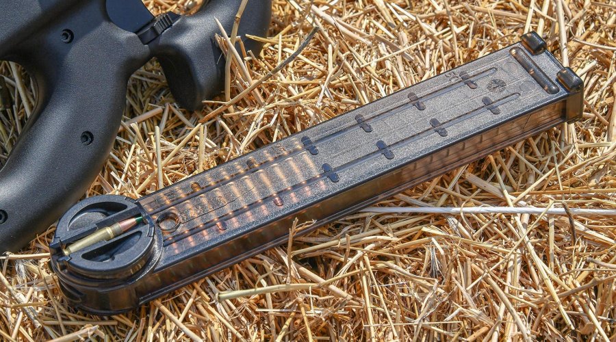 Obviously, the entire gun is designed around the innovative 5.7x28 cartridge and a decidedly characteristic feeding system, namely a translucent double-stack, single-feed box magazine with a capacity of 50 rounds placed above and parallel to the gun. This allowed for an overall size that would be reductive to define small, considering the gun's firepower. The magazine is ingenious: the arrangement of the cartridges is perpendicular to the bore axis and a relatively simple mechanical system rotates the cartridges 90 degrees as they are pushed by the spring through a helical ramp, aligning them with the chamber. The PDW has other notable features such as a bottom ejection port, a low profile non-reciprocating double-sided cocking handle, built-in adjustable sights in the carrying handle, a polymer trigger group, and easy disassembly and tool-free maintenance.