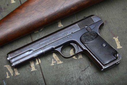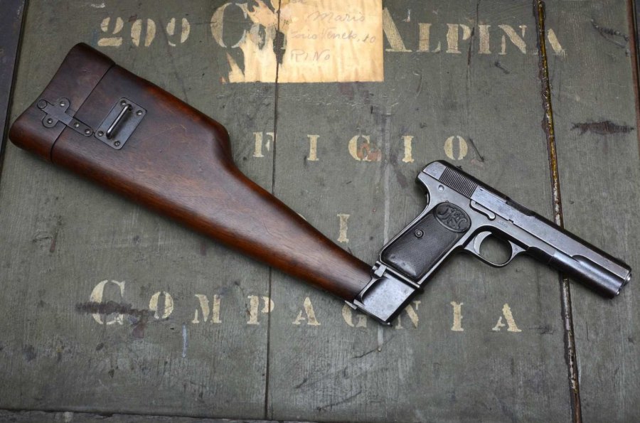 Serial production of this pistol ran from 1908 to 1928 and an estimated 60,000 were produced. Many of these ended up on the US market where they were rechambered in the more common .380 ACP (9mm Short). The one we photographed at the Gunstore Bunker armoury in Milan, Italy, is a rare version of the FN Model 1903 complete with a wood shoulder stock/holster, considered an essential accessory for military pistols at the time. Little it matters that the caliber and the little more than rudimentary sights are not very well suited to long-distance target shooting: after all, collector's firearms are also interesting for these that today seem like oddities to us. Probably in a hundred years, gun enthusiasts will wonder what the Picatinny rails on the frame or the optic-ready slides on contemporary pistols were really for.