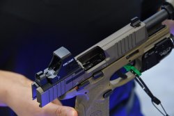 The slide is made of anodized aluminum with some steel details and has the cocking serrations on the front end as well. The sights are made of plastic, and have a standard dovetail that allows them to be adjusted laterally. Mini-reflex optics can be mounted on the slide through polymer adapter plates, while the plate covering the slide cut is made of light alloy and has about the same weight as a Trijicon red dot, to make sure that the mass balance is unchanged. Those who do not like plastic sights can easily replace them with aftermarket models. The frame is polymer, and all controls (safety, slide stop and magazine release) are ambidextrous. A loaded chamber indicator further raises the FN 502's safety level. Ergonomics and grip textures are inspired by those of its big sister, the FN 509, however there are no interchangeable backstraps. On the dust cover we find the now ubiquitous Picatinny slide for mounting accessories.