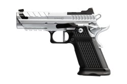 The steel frame is equipped with the now ever-present Picatinny rail for mounting your favourite accessories. The aluminum grips feature a chainlink pattern that makes them extremely grippy, while the grip front- and backstrap are finely checkered for a secure grip. Added to this is the removable mini-magwell for quicker magazine changes and the Wilson-type grip safety. The slide stop, located on the left side only, is oversized. The trigger is single-action only, with a skeletonized steel trigger blade machined from a solid billet; the hammer is also skeletonized.