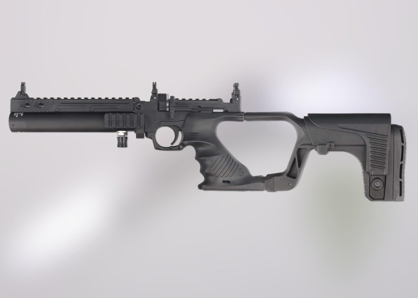 The aesthetics of the Hatsan Jet echo that of an academic shooting pistol with a good injection of "badassery", this thanks mainly to the "all black" surface finish and the rails for the mounting of optics. Complementing the "tactical" effect is also and especially the removable polymer buttstock, which is telescopic and features an adjustable cheek rest allowing the gun to be transformed into a very compact mini-carbine. The semi-anatomical grip, with its lower extension, also contributes to this pistol's appearance as an ultimately intriguing hybrid. As standard, the Hatsaj Jet has a sight set consisting of an elevation- and windage-adjustable notch and a Truglo front sight with fiber optic inserts. However, the gun is optics-ready, with a classic 11mm/22mm wide airgun rail. This allows the use of most PCP gun optics with dedicated mounts on the market.
