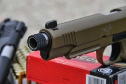 The sights are suppressor-height tritium night sights with a rear fixed cocking shoulder. Both frame and slide are finished in a KimPro II Desert Tan color finish. Just as the Warrior, the TFS pistol uses Kimber G-10 tactical grips.